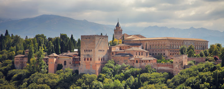 Granada is located at the foot of the Sierra Nevada mountains, at the confluence of three rivers, the Beiro, the Darro and the Genil, and is one hour from the Mediterranean coast, the Costa Tropical. It has a population of a half million and has preserved the Alhambra, a Moorish citadel and palace, and the Albaicín's examples of Moorish and Morisco construction. The pomegranate (in Spanish, granada) is the heraldic device of Granada.